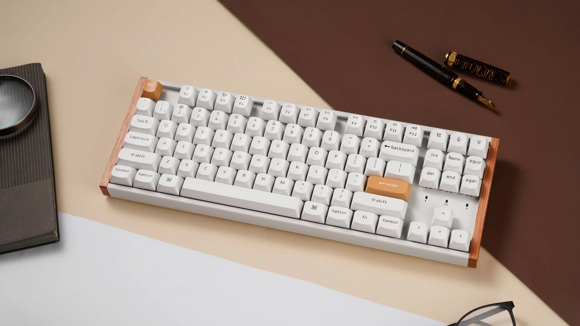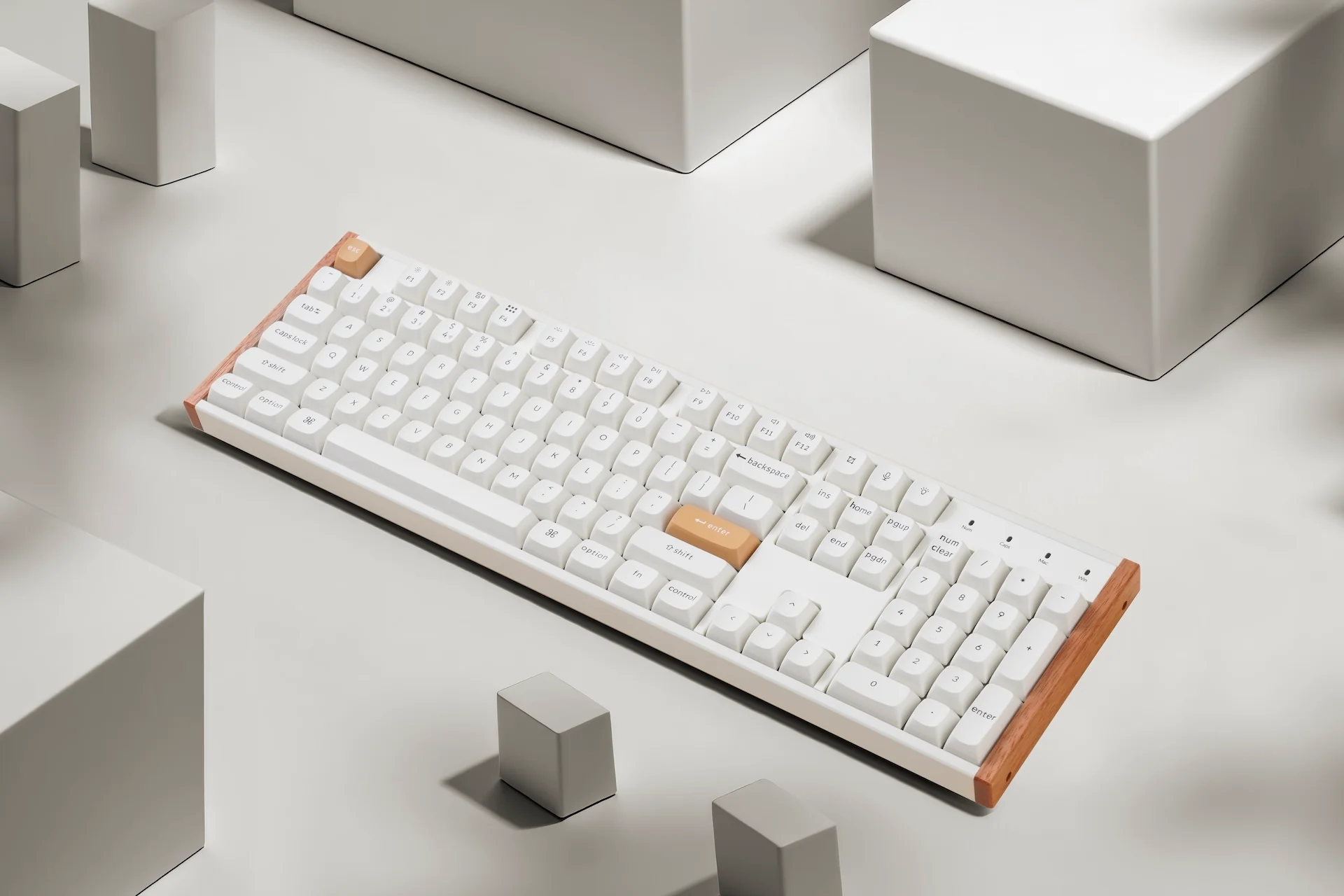 It drops both the numpad and the function row, so the footprint is tiny. Add in the rosewood aesthetic on a board this small, and it looks almost sculptural on a desk.
